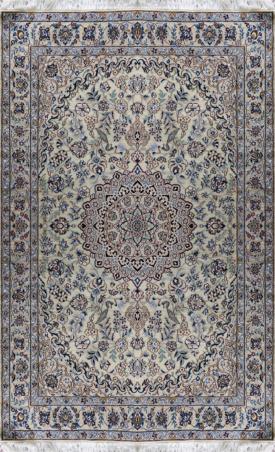 فرش دستبافت نایین ۹لا با طرح گل ابریشم و زمینه کرم