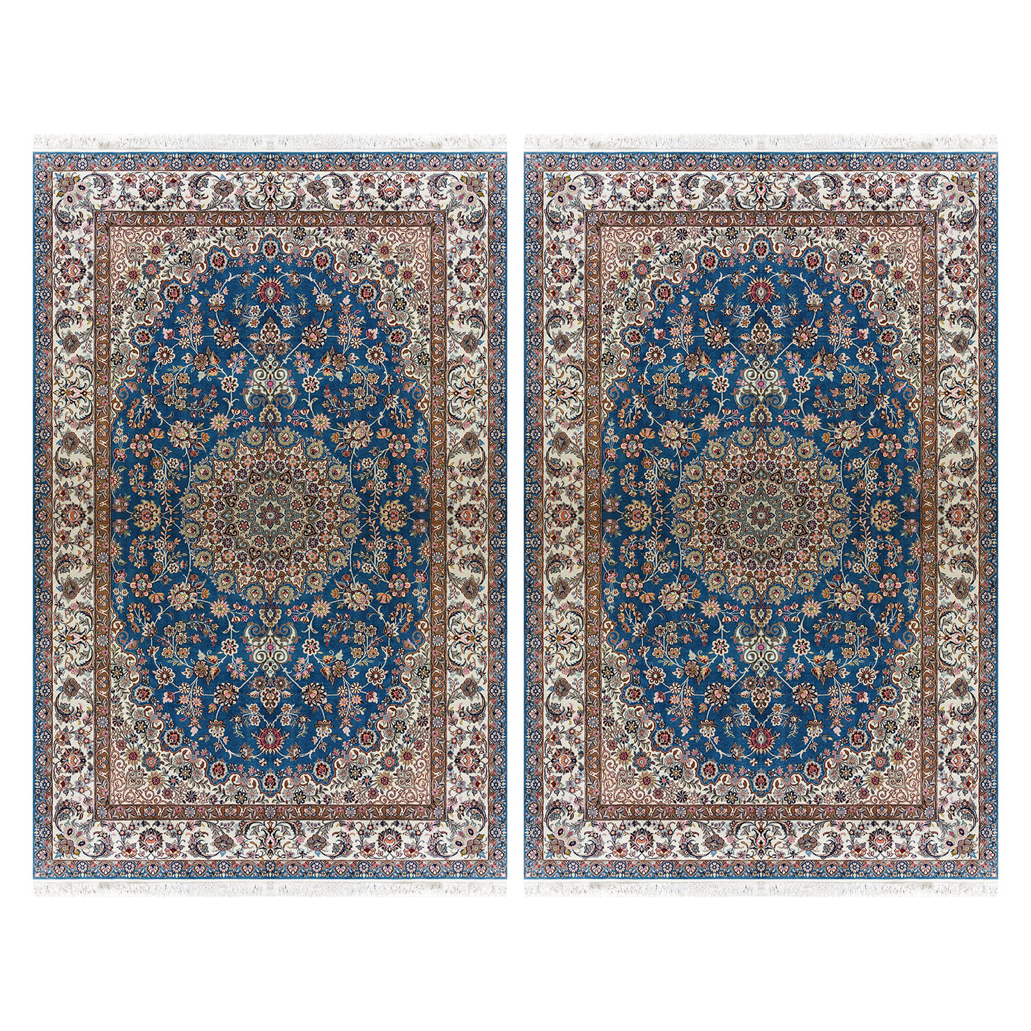 فرش دستباف نایین آبی نقشه لچک و ترنج ۹ لا گل ابریشم – جفت ۶ متری (۳۰۵ × ۲۰۴ و ۳۰۵ × ۲۰۴ سانتی‌متر) – کدهای ۱۱۱۱ و ۱۱۱۰