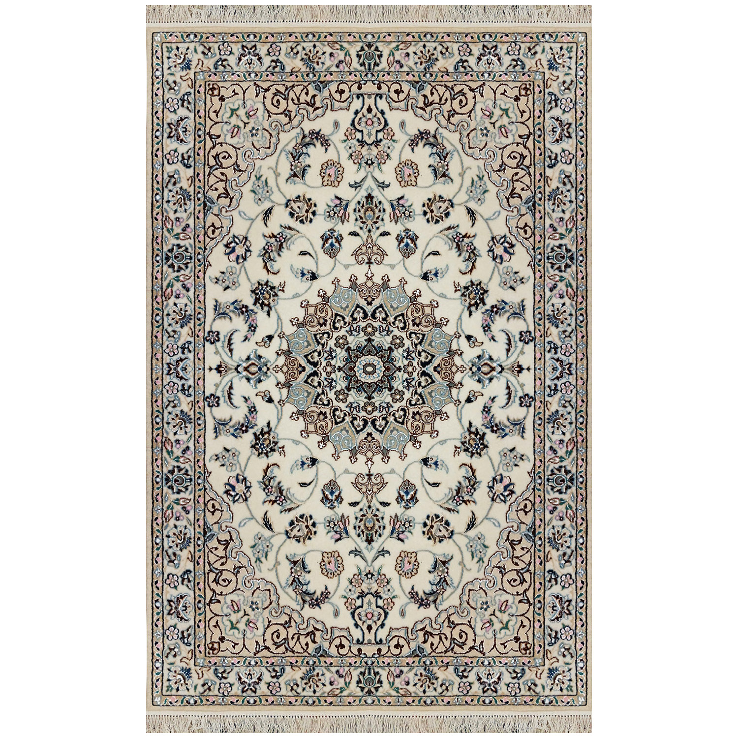 ویژگی‌های برجسته فرش دستباف نایین کرم نقشه لچک و ترنج ۶ لا گل ابریشم – ذرع و چارک (۸۰×۱۲۵ سانتی‌متر) – کد ۹۸۸