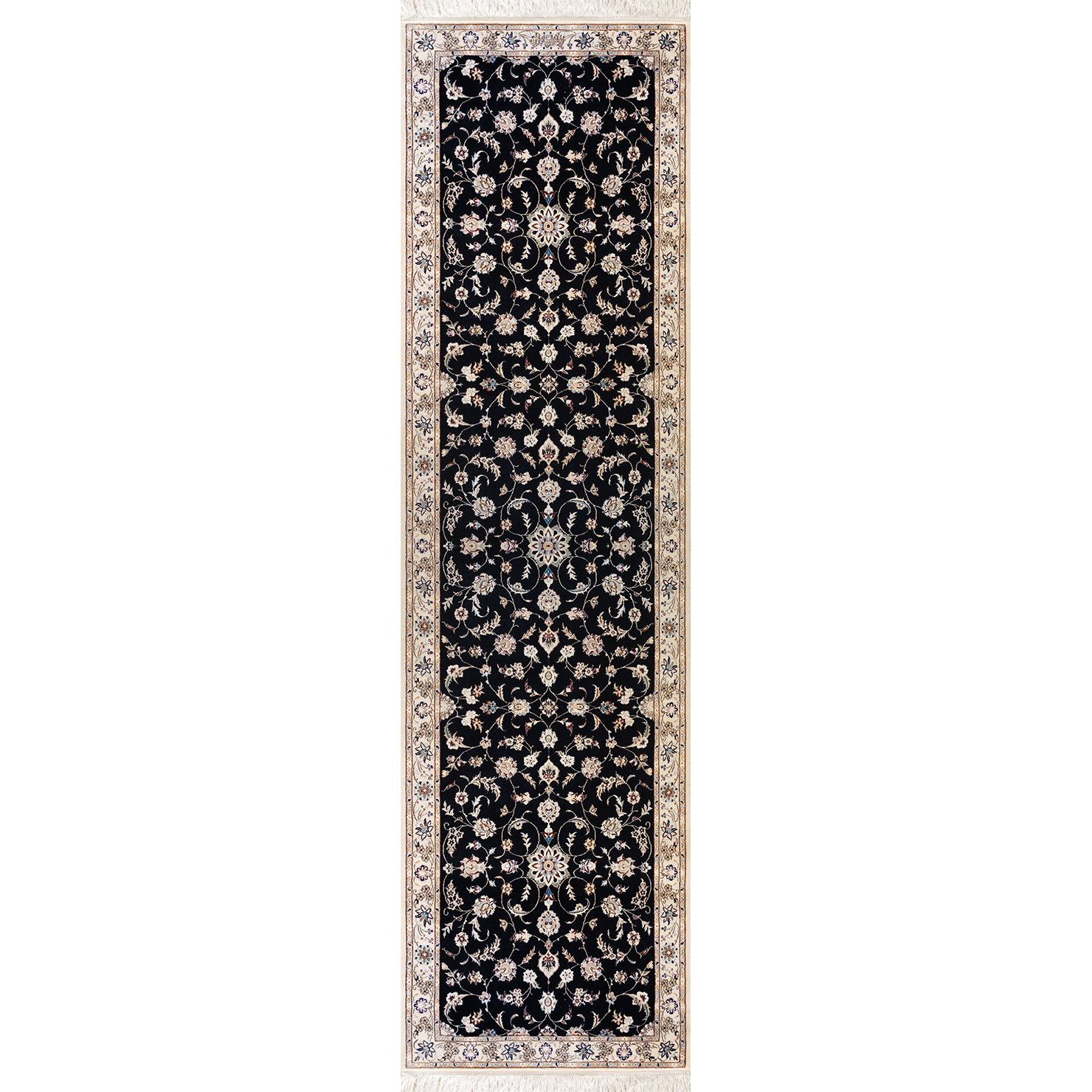 فرش دستباف نایین سرمه‌ای نقشه افشان ۶ لا گل ابریشم – سایز کناره (۸۵ × ۳۱۵ سانتی‌متر) – کد ۱۰۸۵
